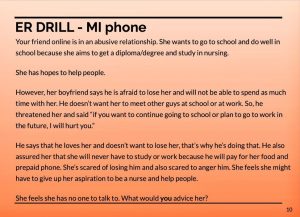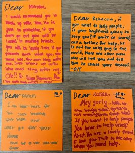 For the second activity, PSGC’s Emotional Regulation Drill topic on “MI-Phone” was incorporated into the exercise so that the residents could practise empathy towards other women who might be in an abusive relationship. A scenario as shown below was given and the residents’ messages to the woman given in the scenario could be seen below. After sharing what they had written, the residents also shared some of the real-life examples they experienced witnessing their online friends online who publicly shared their toxic relationship and how they felt about it. Lastly, residents shared with Ms Nora who were their trusted safe person or adult they could talk to if they were in an abusive relationship themselves.