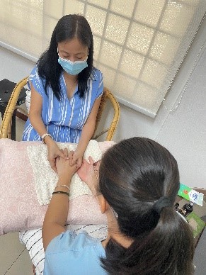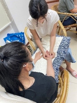 Accompanying the selection of essential oils, massage techniques were introduced after. The various hand massage techniques were designed to reduce tension, improve blood circulation, and induce relaxation. They emphasized the importance of gentle pressure and rhythmic movements, allowing the female programme participants to connect with their own bodies and experience the profound impact of good and healing touch. One programme participant shared that the massage lifted the heaviness  in her heart as the pressures made her realise that such pressure is positive and it helped her to release the trauma she had experienced.