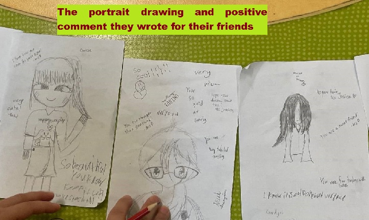 While the upper primary students, Primary 3 and above, got to learn about how to be happier together. The four simple actions are: to give positive comments to as many people as possible today, really listen to what people say without judging them, to share an encouraging stories from the news to inspire others and reach out to a friend or family member who needs support. Afterwards, the students played a game called “Spread the Happiness”. The students would find a partner to draw a portrait of each other. After they are done with the drawing, everyone’s drawings were displayed and they would go around to write a positive comment about that person on their portrait. They wrote for each other with, “You are helpful.,” “You are a nice person to play with,” “You help others learn,” It was a pleasant experience as they took their time to think and leave the positive and meaningful comments to their friends.