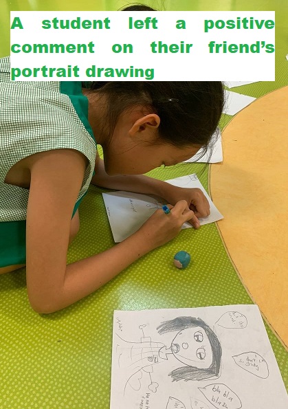While the upper primary students, Primary 3 and above, got to learn about how to be happier together. The four simple actions are: to give positive comments to as many people as possible today, really listen to what people say without judging them, to share an encouraging stories from the news to inspire others and reach out to a friend or family member who needs support. Afterwards, the students played a game called “Spread the Happiness”. The students would find a partner to draw a portrait of each other. After they are done with the drawing, everyone’s drawings were displayed and they would go around to write a positive comment about that person on their portrait. They wrote for each other with, “You are helpful.,” “You are a nice person to play with,” “You help others learn,” It was a pleasant experience as they took their time to think and leave the positive and meaningful comments to their friends.