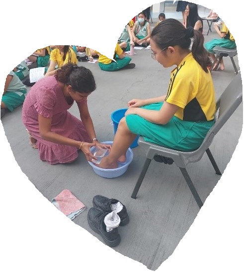 Students taking Catholic Values Education, staff and volunteer catechists participated in the washing of feet event, enacting Jesus’ humility that happened on the very first Maundy Thursday evening, when Jesus instituted the Eucharist (the very first Mass) and humbled himself as a servant, knelt down to wash the feet of his disciples, including the one who was to betray him.